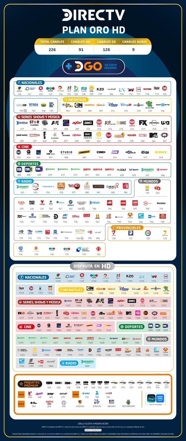 El más elegido por todos!!! El plan ORO HD te permite acceder a los principales y más variados canales de TV a un precio accesible y la mejor calidad visual a través de sus 226 canales. Con la amplia cobertura de DIRECTV, estamos listos para llegar a cualquier lugar donde necesites.